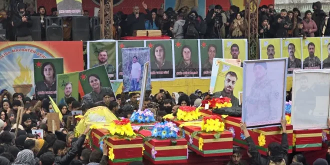 شيّع أهالي مدينة القامشلي شمال شرق سوريا، اليوم الأربعاء، عشرة من مقاتلي ومقاتلات قوات سوريا الديمقراطية “قسد”، قضوا خلال المواجهات الجارية مع قوات الحكومة السورية في مناطق شمال شرق البلاد.