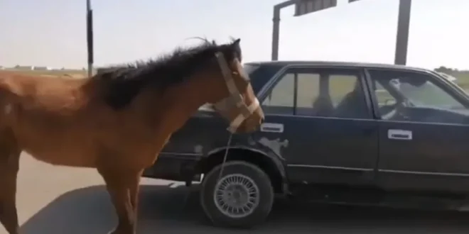 الدوريات رصدت مركبة صالون تقوم بسحب حصان مربوط بمؤخرتها على أحد الطرق، في مشهد