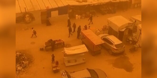اجتاحت عاصفة رملية المخيمات في جنوب ووسط قطاع غزة، فحوّلت السماء إلى لون برتقالي فاقع ودمرت الملاجئ وجرفت الممتلكات، بينما كافح آلاف الفلسطينيين النازحين رياحًا عاتية لإنقاذ مساكنهم المؤقتة.