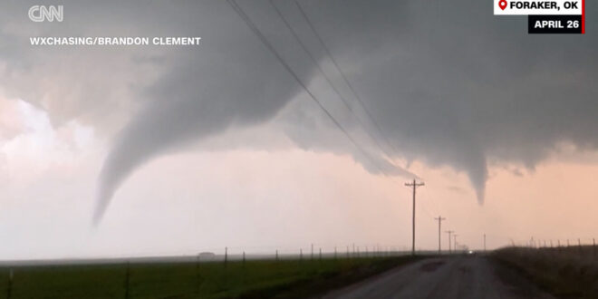 شُوهد إعصاران متزامنان في منطقة ريفية قرب فوركر، بولاية أوكلاهوما الأمريكية، في ظلّ احتمال هبوب عواصف شديدة تهدد أجزاءً من الغرب الأوسط الأمريكي.